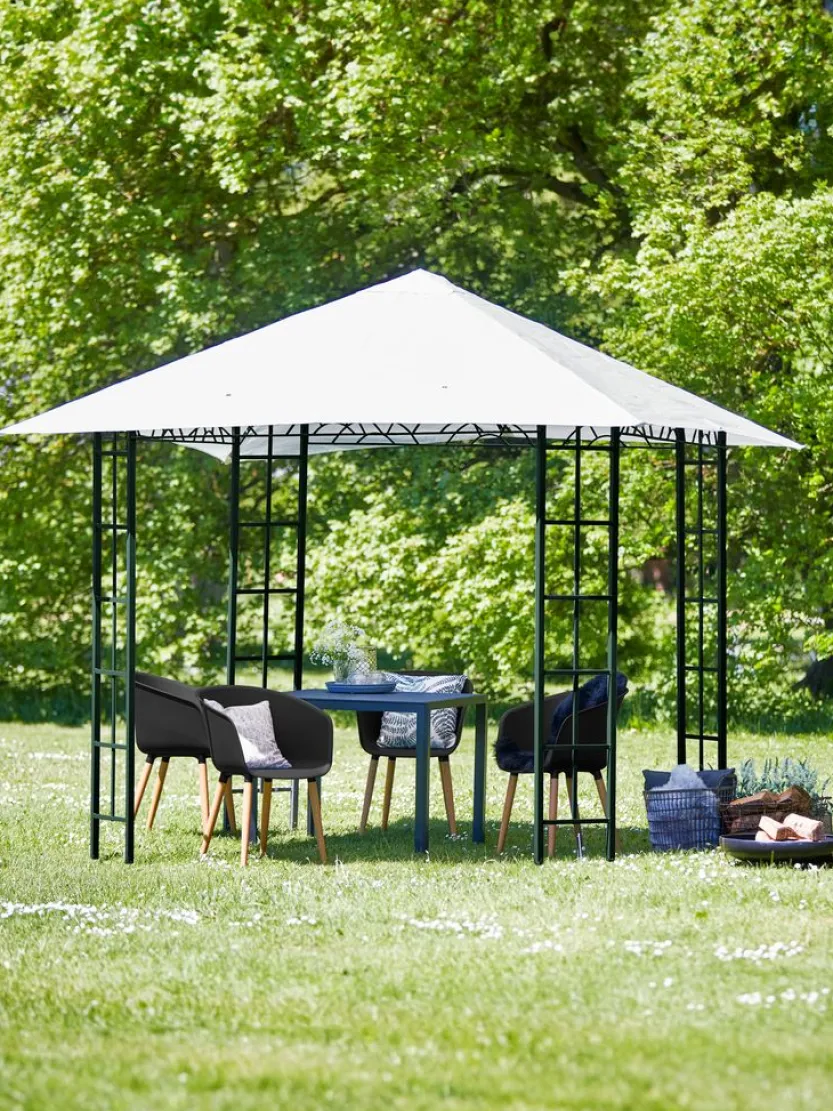 Stalen frame met waterafstotend polyester doek. Waterdichtheid 700 mm. Gewicht 26 kg. De zijpanelen zijn los verkrijgbaar. B3 x L3 x H2.65 m