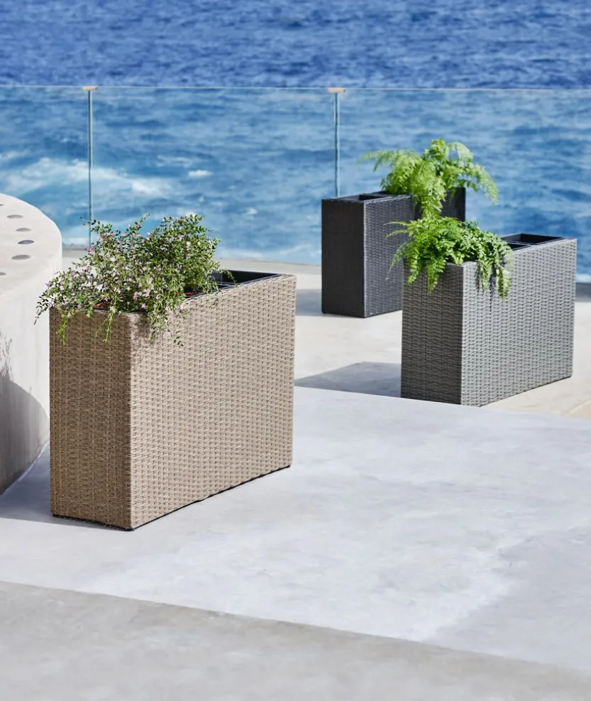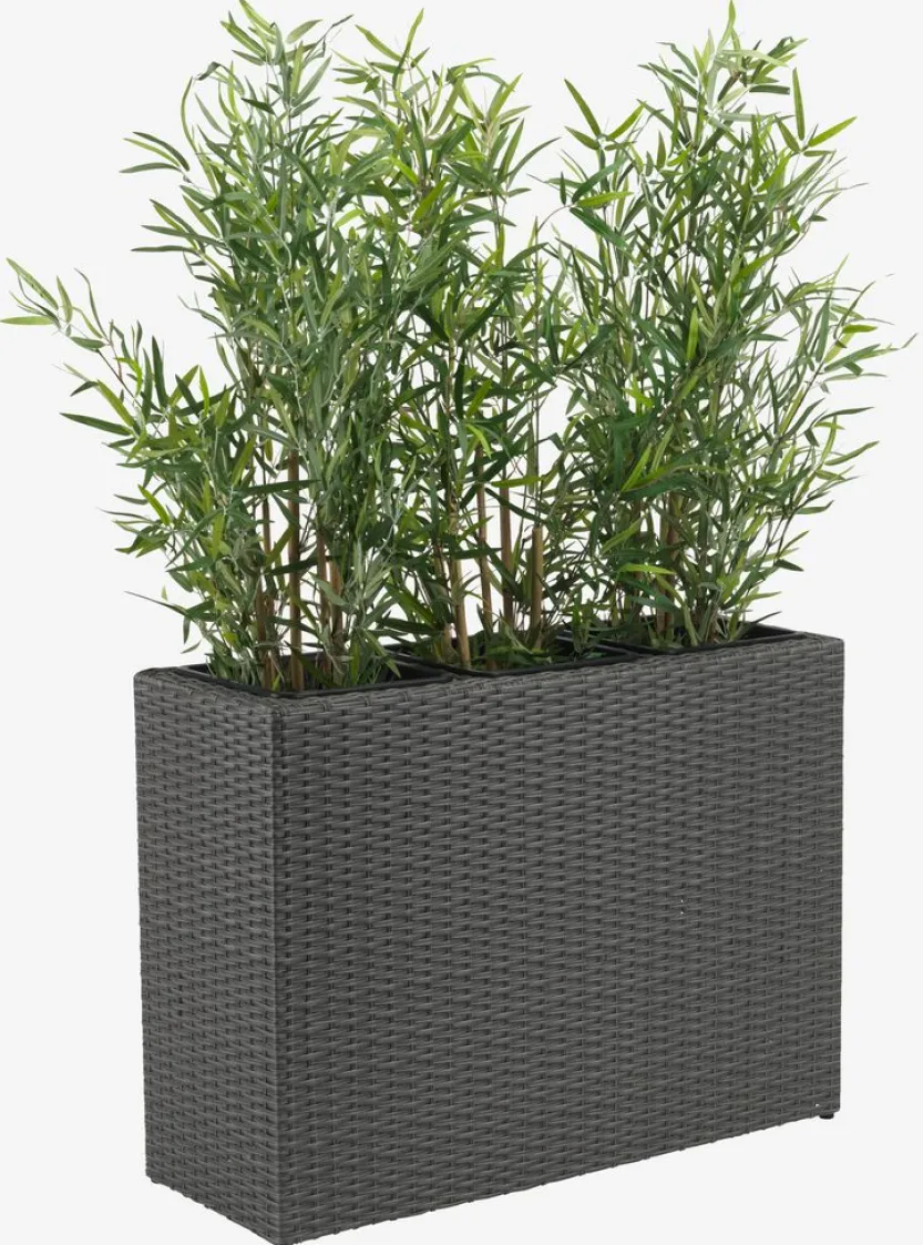 Grijze plantenbak in polyrattan met een stevig stalen frame. De plantenbak heeft 3 compartimenten, waardoor je de mogelijkheid hebt om drie gelijke of verschillende planten en bloemen te planten. Een afvoergat kan eenvoudig worden gemaakt om ervoor te zorgen dat overtollig water kan weglopen. De plantenbak kan ook worden gebruikt als roomdivider. B30 x L83 x H60 cm
