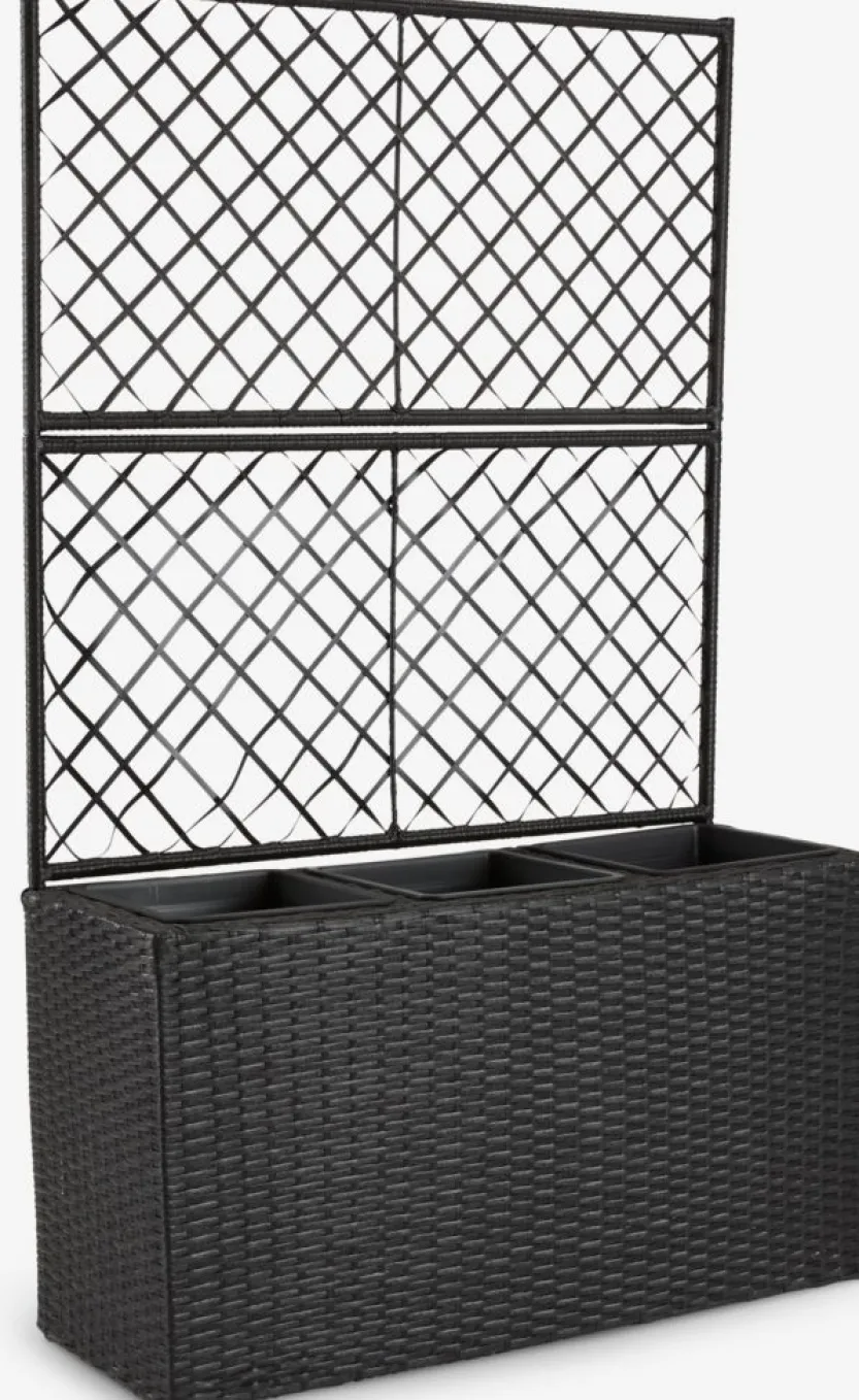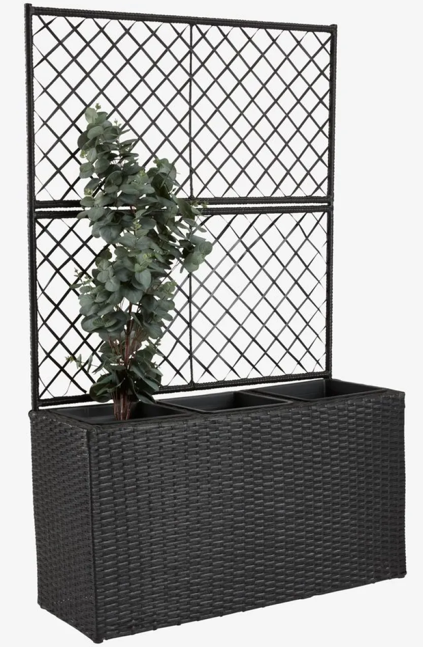 Zwarte plantenbak met trellis, gemaakt van polyrattan en gegalvaniseerd staal. Ideaal voor het creëren van een groene afscheiding rond je terras of voor het opdelen van je buitenruimte. Het trellis biedt ondersteuning voor klimplanten, en wanneer het bedekt is, geeft het een mooi en decoratief effect. Een afvoergat kan eenvoudig worden gemaakt om ervoor te zorgen dat overtollig water kan weglopen. B30 x L83 x H130 cm
