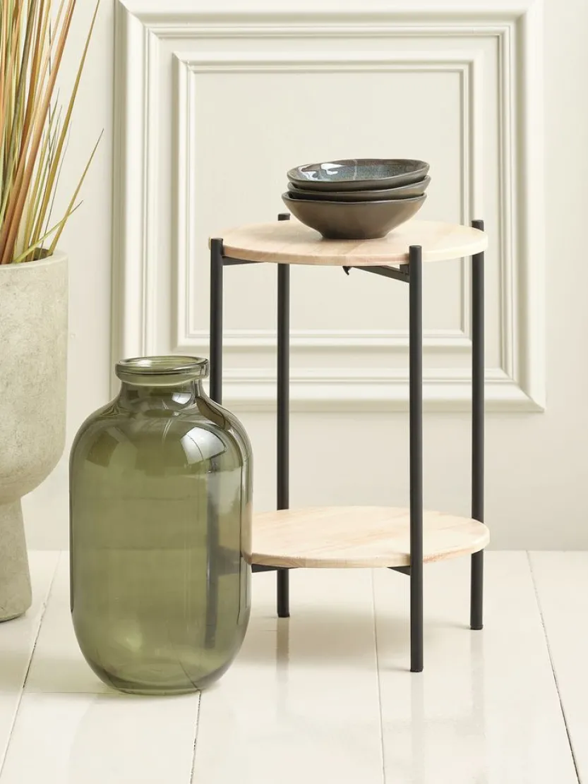 Plantenstandaard in een strak design met een natuurlijke houten afwerking en een zwart stalen frame. De plantenstandaard heeft twee ronde planken, ideaal voor het neerzetten van decoratie of kleine planten. De combinatie van hout en staal geeft het een moderne maar tijdloze uitstraling, waardoor het een veelzijdige aanvulling is voor elke ruimte. Ø32 x H45 cm
