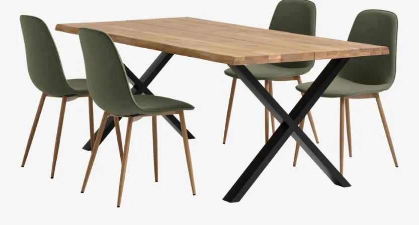 ROSLEV L200 tafel naturel eiken + 4 BISTRUP stoelen olijf