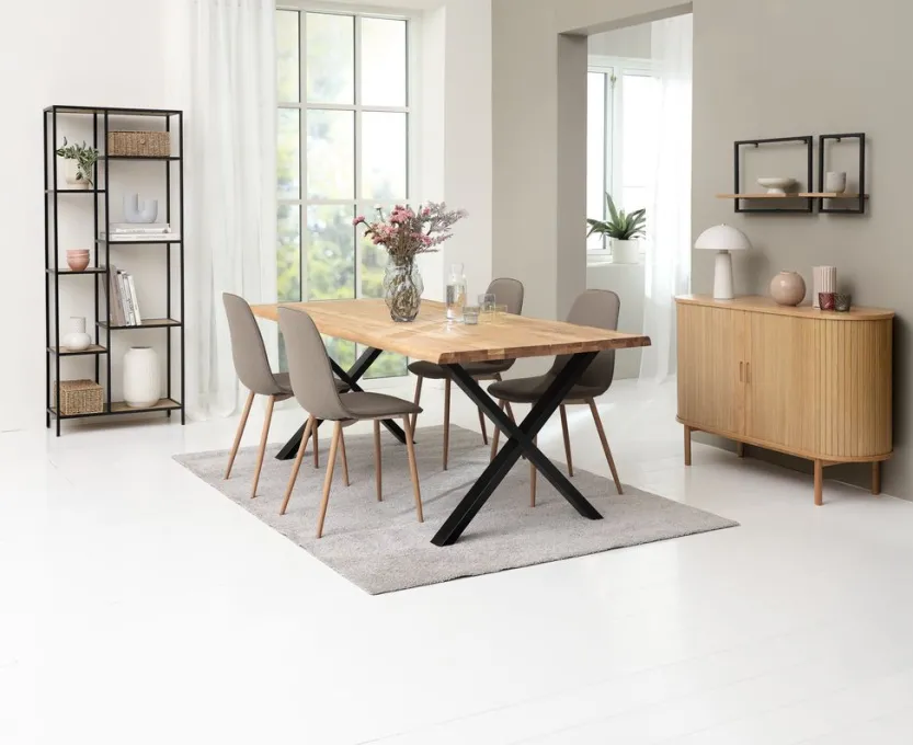 Tafel: Massief eiken en staal. Excl. verlengbladen. B95 x L200 x H75 cm. Stoel: Stof en staal.