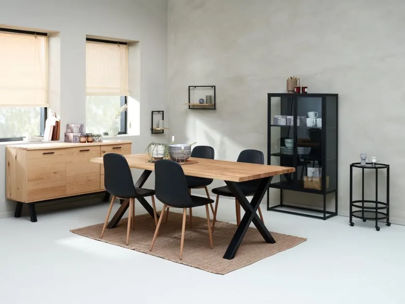 Tafel: massief eiken en staal. Excl. verlengbladen. B95 x L200 x H75 cm. Stoel: kunstleer en staal.