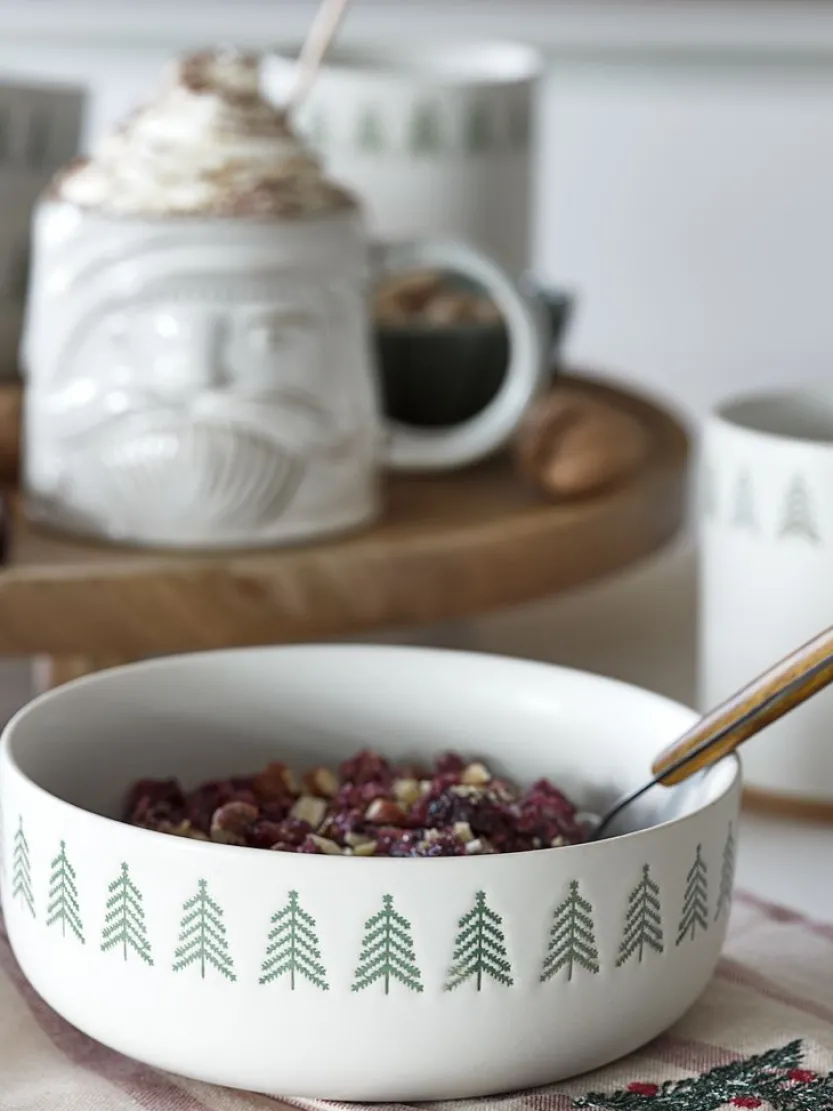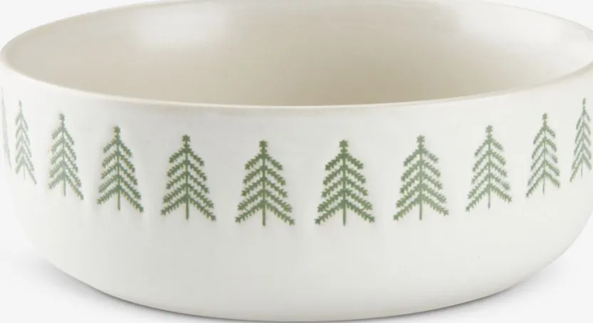 Witte schaal met groene kerstboompatronen. Deze schaal is ideaal voor het serveren van voedsel tijdens de feestdagen en heeft een feestelijke uitstraling die perfect past bij de kerstdecoratie. De schaal is vaatwasserbestendig, waardoor hij eenvoudig schoon te maken is. Ø16 x H6 x L800ml cm