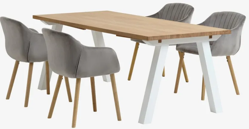 SKAGEN L200 tafel wit/eiken + 4 ADSLEV stoelen fluweel grijs