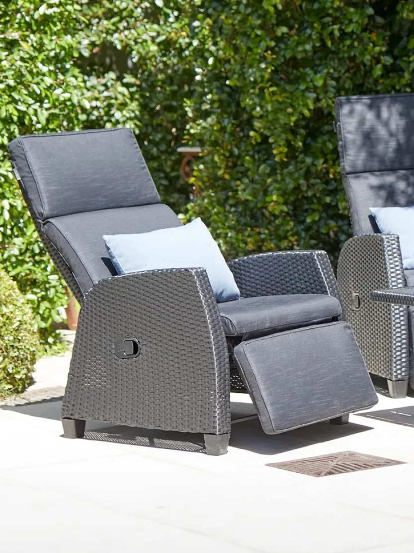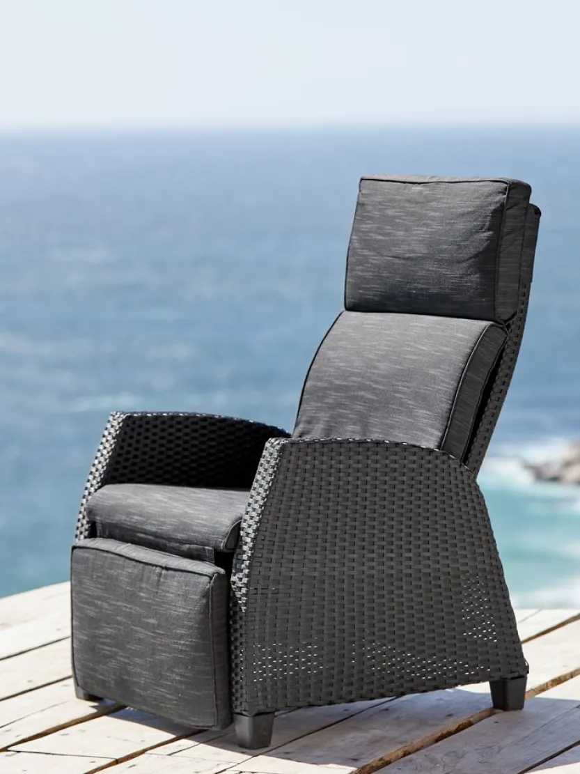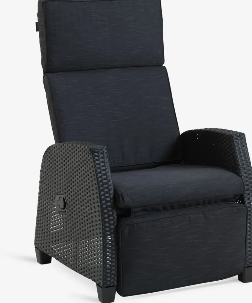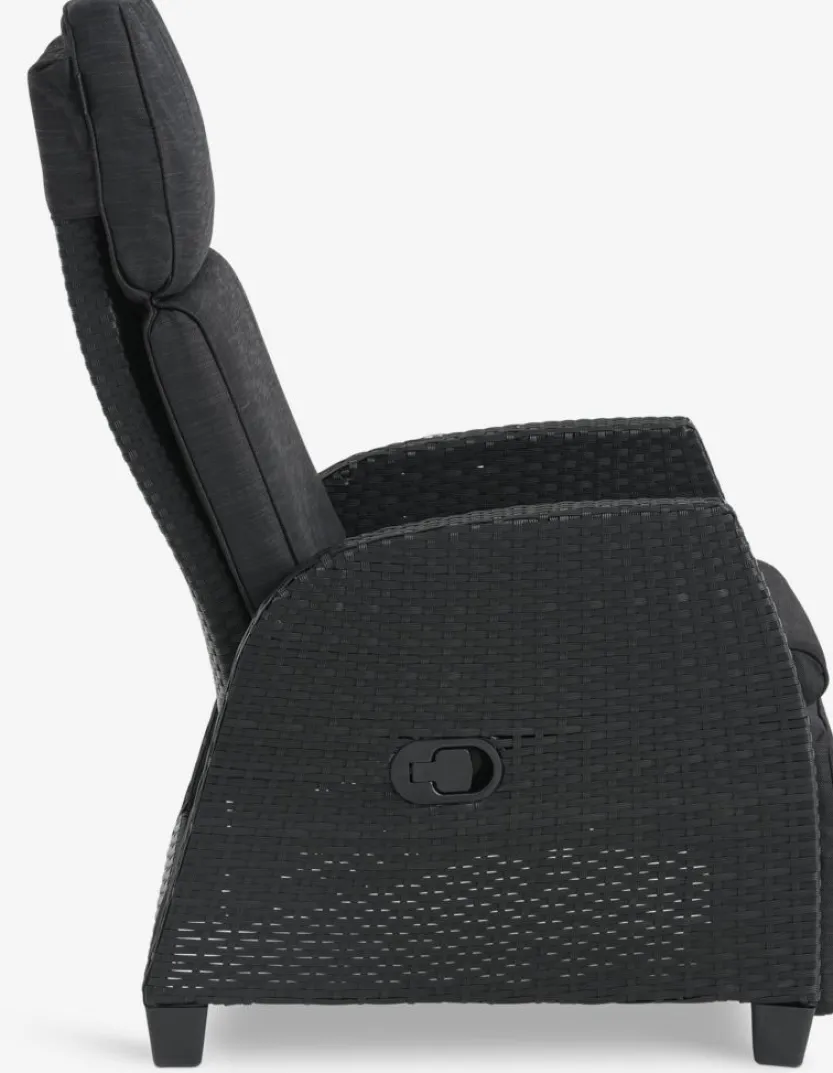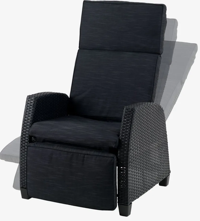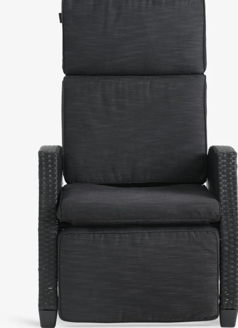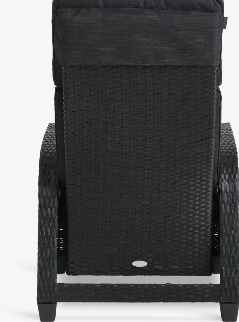 Standenstoel van aluminium en polyrotan. Traploos verstelbare rugleuning en voetensteun. Incl. luxe kussen met een duurzaam, structuurgeweven hoes. B66 x H102 x D80 cm