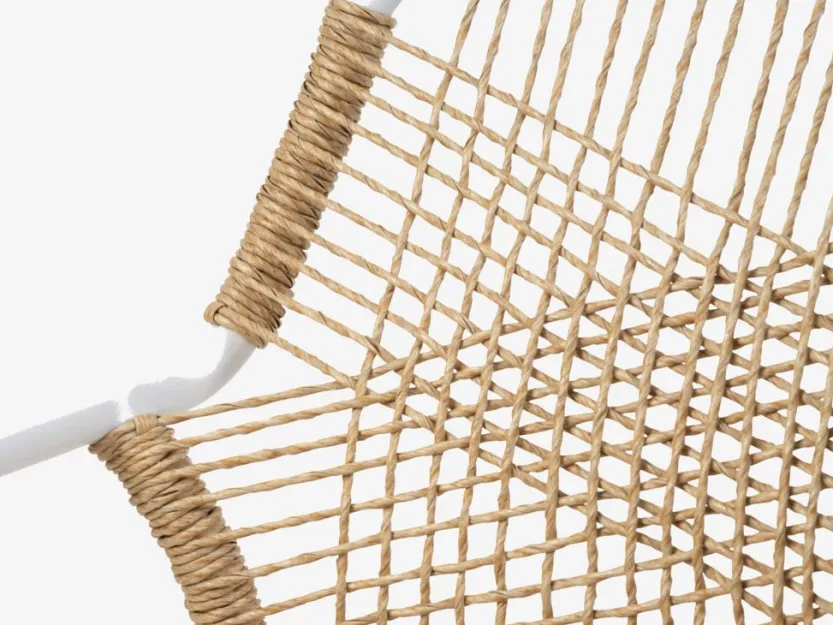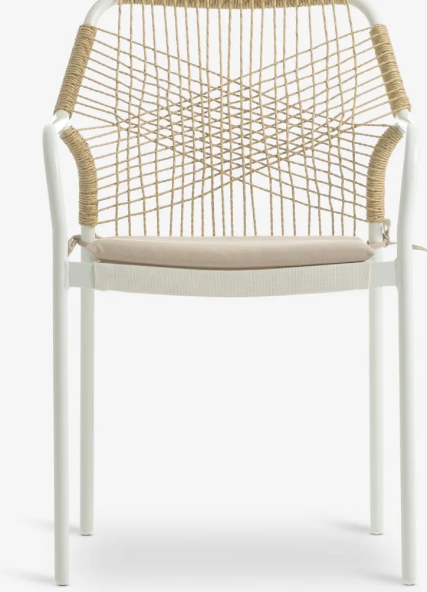 Witte stapelstoel met een zitting van textileen en een rugleuning van polyrotan. Inclusief kwaliteitskussen met duurzame hoes. Frame van aluminium met poedercoating. Textileen is een comfortabel, kleurecht materiaal dat snel droogt en gemakkelijk schoon te maken is. Polyrotan geeft een natuurlijke vlechtwerklook en is weerbestendig en onderhoudsvrij. Aluminium is een lichtgewicht en robuust materiaal dat niet roest. De tuinstoel kan gestapeld worden voor compact opbergen.