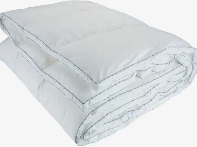 Synthetisch dekbed 135×200 cm met opstaande rand. Unieke vulling van gesiliconiseerd Trevira Fibelle synthetisch dons, 1200g in totaal. De zachte, lichte vulling behoudt zijn volume en isolatievermogen. Zachte tijk van 100% cambric katoen. Boxconstructie met genaaide wanden voor isolatie zonder koude plekken. Wasbaar op 60°C. Incl. opbergtas.
