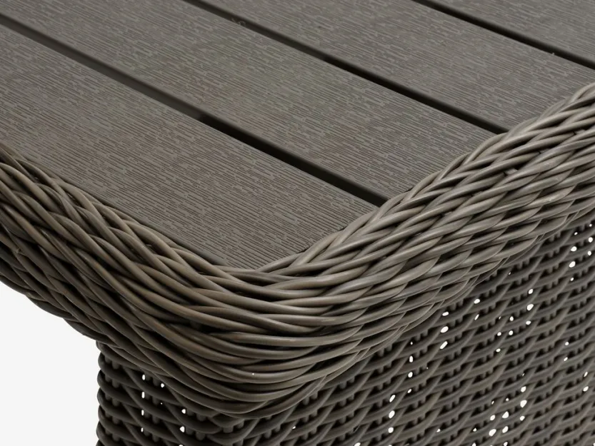 Grijze tuintafel met een tafelblad van kunsthout. Frame en poten van polyrotan en aluminium met poedercoating. Kunsthout heeft het uiterlijk en de textuur van natuurlijk hout zonder dat er onderhoud nodig is. Aluminium is een lichtgewicht en robuust materiaal dat niet roest. B100 x L225 x H74 cm