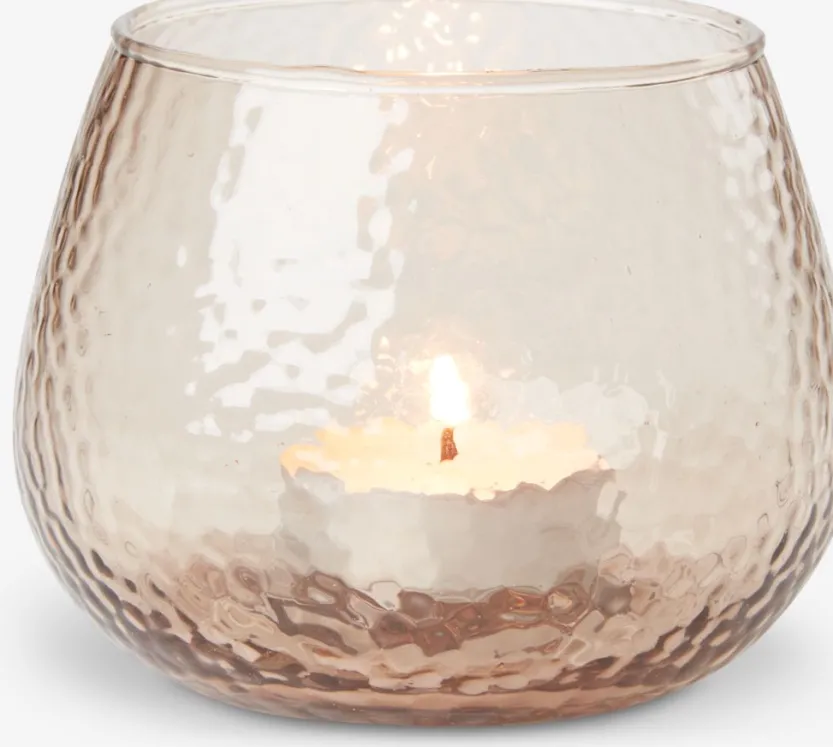 Bruine theelichthouder gemaakt van glas met een licht gebobbeld oppervlak. Deze houder verspreidt het licht op een sfeervolle manier en voegt een warme gloed toe aan elke ruimte. Ø10 x H8 cm