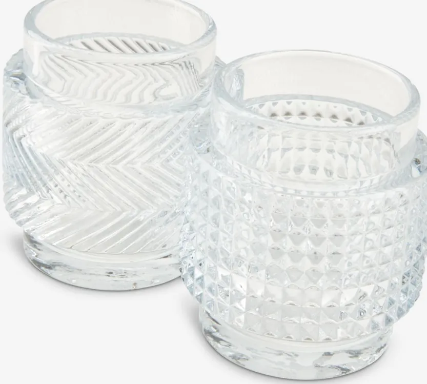 Set van 2 theelichthouders gemaakt van helder glas. Deze theelichthouders hebben unieke, decoratieve patronen die het licht zachtjes verspreiden en een warme sfeer creëren. Perfect om elke ruimte een elegante uitstraling te geven. Ø7 x H8 cm