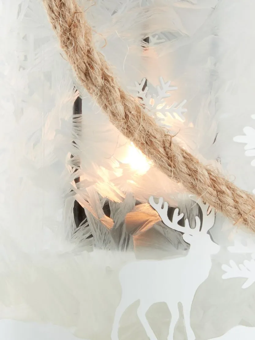 Kerst theelichthouder gemaakt van glas met een ijzeren hengsel en jute touw. De houder heeft een decoratief winterlandschap met bomen en herten, wat een sfeervolle en feestelijke uitstraling geeft wanneer een kaarsje brandt. Het jute touw dient als handvat, waardoor de theelichthouder eenvoudig te verplaatsen is. Ø10 x H20 cm