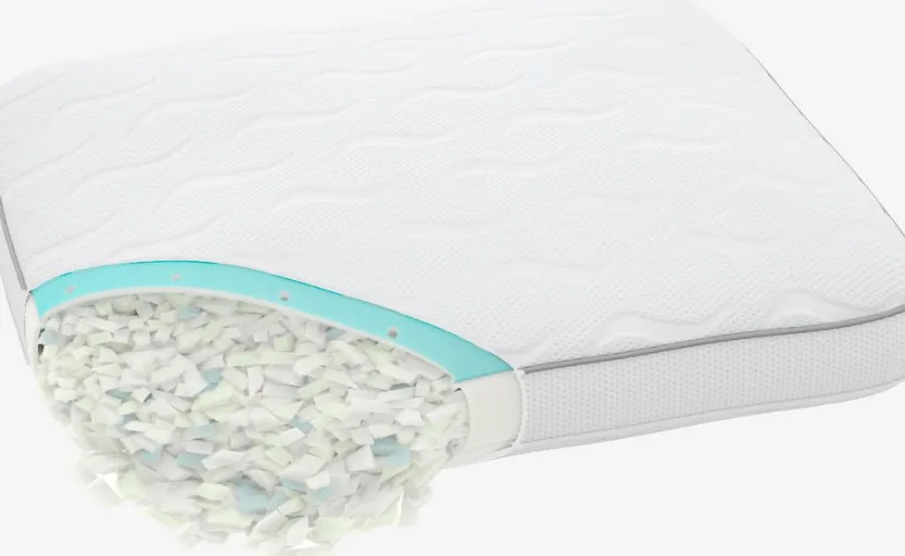 Traagschuim hoofdkussen 48x58x15 cm van drukverlagend, versnipperd AIR traagschuim met verkoelende gel. AIR traagschuim vormt zich snel en precies naar je nek en schouders, zelfs in een koele slaapomgeving. Eén kant van het kussen heeft een laagje verkoelende gel, waardoor je kunt wisselen tussen een normale en een koelere kant. De hoogte van het kussen kan worden aangepast door een deel van de vulling te verwijderen. Polyester tijk met verkoelend polyethyleen aan één kant, wasbaar op 40°C. Gewatteerd met AIR traagschuim.