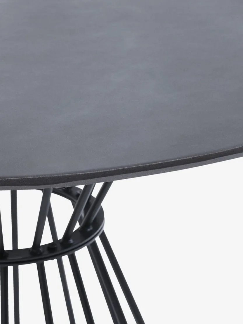 Ronde tuintafel met een grijs tafelblad van hittebestendig vezelcement en een zwart onderstel van gepoedercoat staal. Ø110 x H75 cm