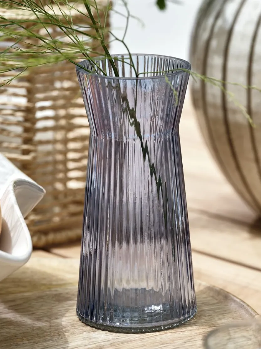 Blauwe glazen vaas met een geribbeld ontwerp en een toelopende vorm. Deze vaas voegt een stijlvolle en moderne touch toe aan elk interieur en is perfect voor het presenteren van bloemen of als decoratie. Ø7,7 x H16 cm