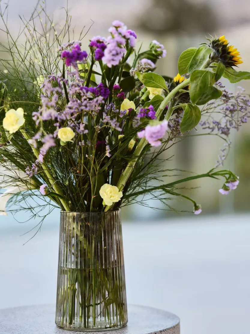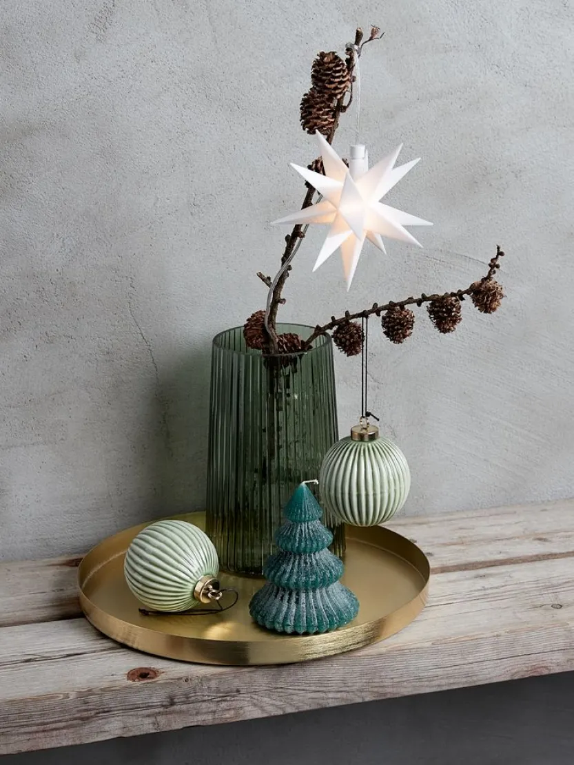 Groene glazen vaas met een geribbelde structuur. De vaas heeft een elegante cilindrische vorm die perfect is voor het tentoonstellen van bloemen of als op zichzelf staand decoratief item. Het reflecterende oppervlak vangt het licht en voegt diepte en karakter toe aan de uitstraling van de vaas. Ø13 x H20 cm