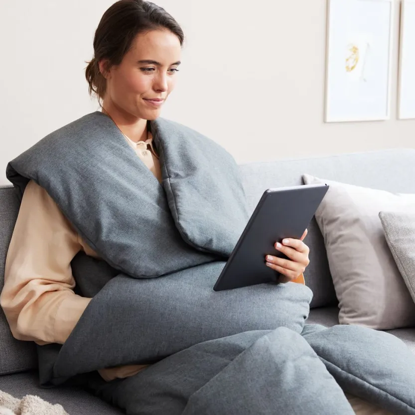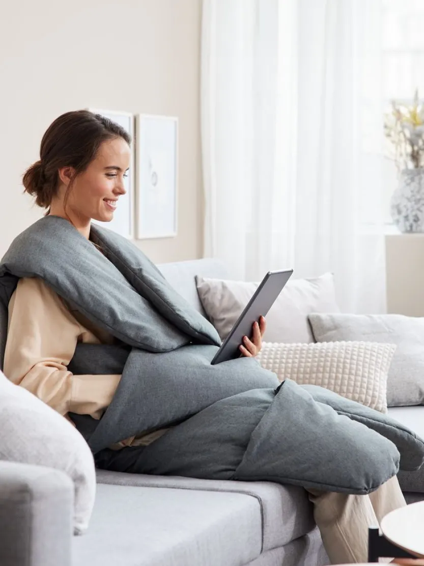 Verzwaringsdeken 6 kg met 70% kunststof bolletjes/30% polyestervezel. Het gewicht van de kunststof bolletjes zorgt voor een zachte, gelijkmatige druk op het lichaam, dat een kalmerend en ontspannend effect geeft. Het plaid is verdeeld in 6 vleugels, waardoor het nauw om de schouders, het bovenlichaam en de dijen kan worden gewikkeld. Tijk van 100% polyester. 152×171 cm