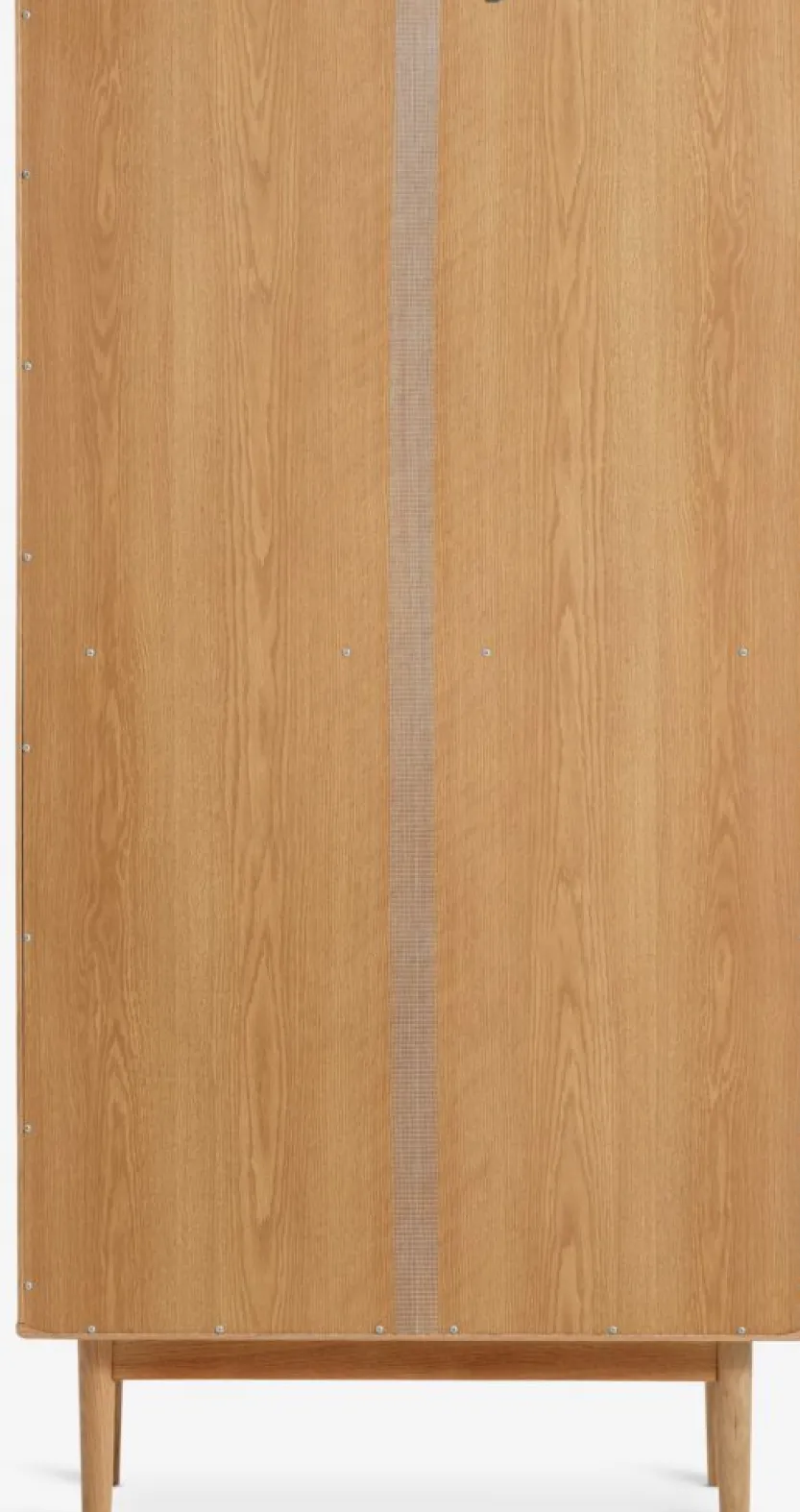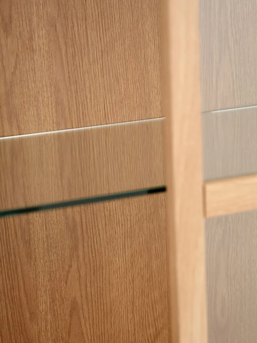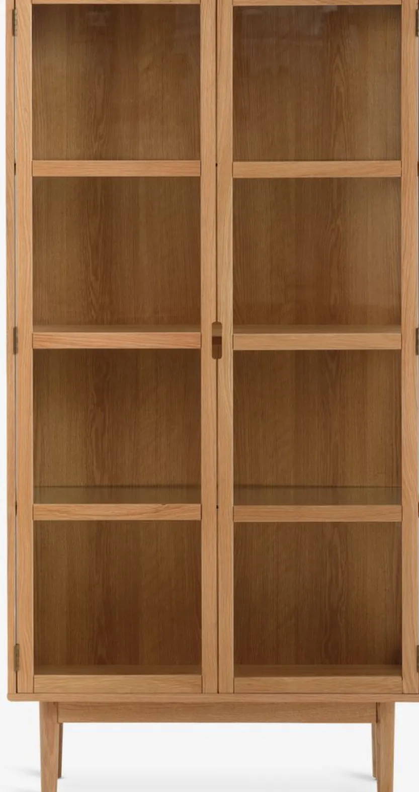 Massief eiken, eiken fineer en gehard glas. B80 x H159 x D35 cm