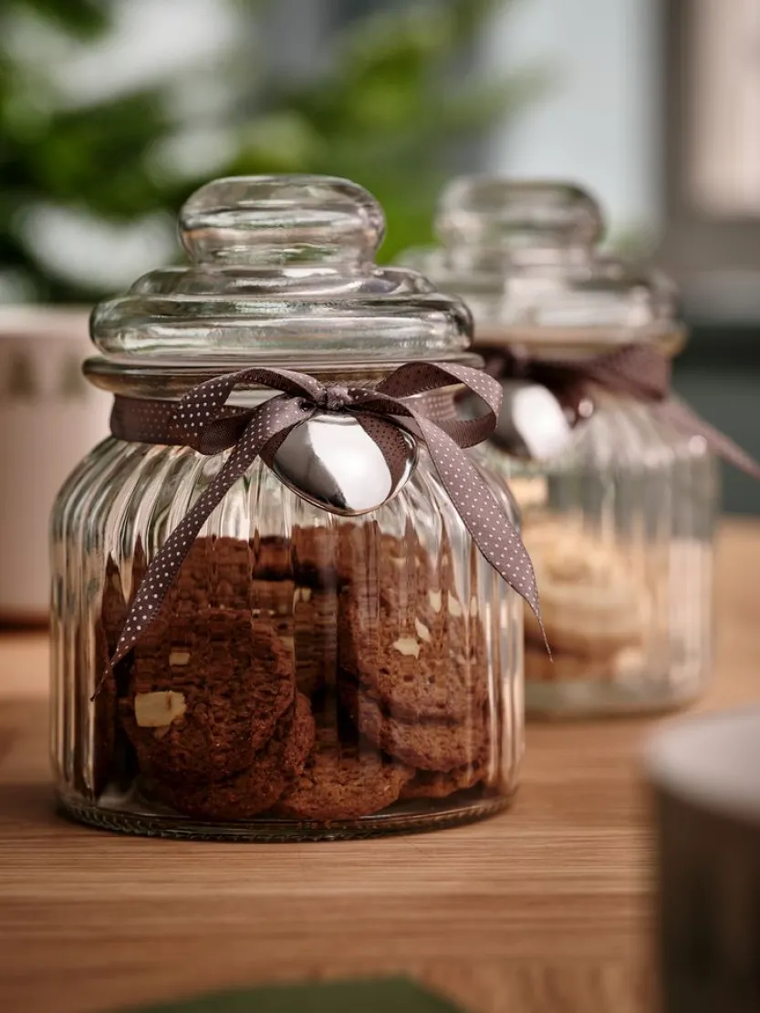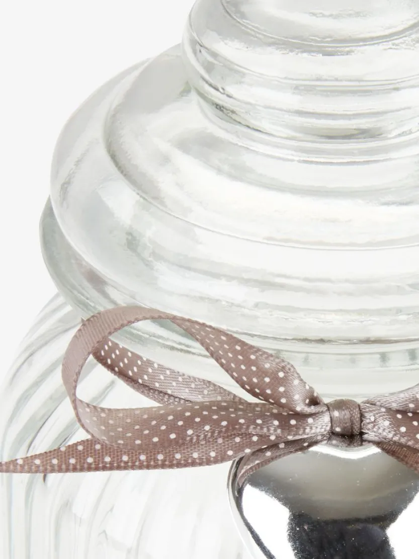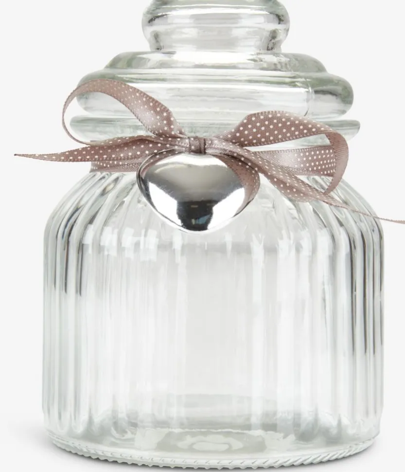 Helder voorraadpot met een decoratieve strik en hartvormige hanger. De pot heeft een geribbeld ontwerp en een bijpassend deksel. Perfect voor het bewaren van verschillende kerstlekkernijen of andere items in huis. Ø11 x H14,5 cm