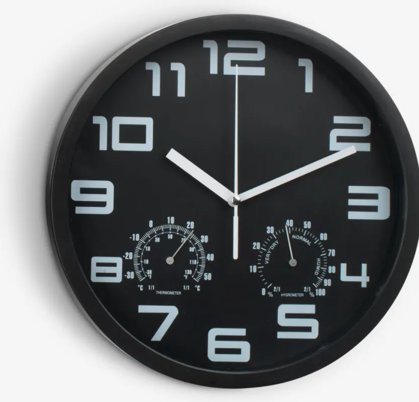 Zwarte wandklok met een strak en modern design. De klok heeft grote witte cijfers en wijzers, waardoor de tijd gemakkelijk af te lezen is. Daarnaast zijn er twee extra wijzers die de temperatuur en luchtvochtigheid aangeven. Perfect voor elk interieur. Diameter: 25 cm