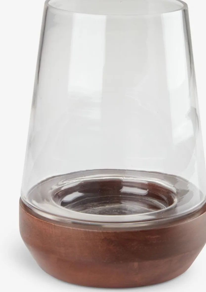 Windlicht van helder glas met een onderkant van walnotenhout. De combinatie van transparant glas en natuurlijk hout creëert een harmonieuze look die past bij verschillende interieurstijlen. Ø15 x H21 cm