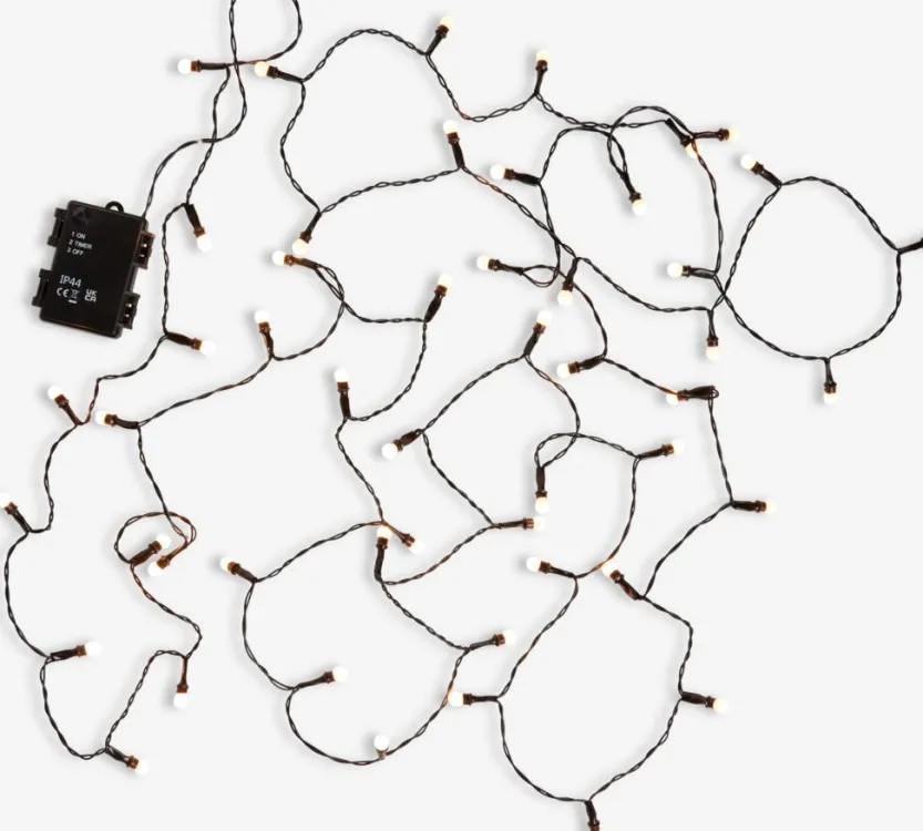 Voor gebruik buitenshuis. 50 LED’S. Warm wit licht. Met timer. Excl. batterijen. 4,9 m lampjes + 0,3 m snoer